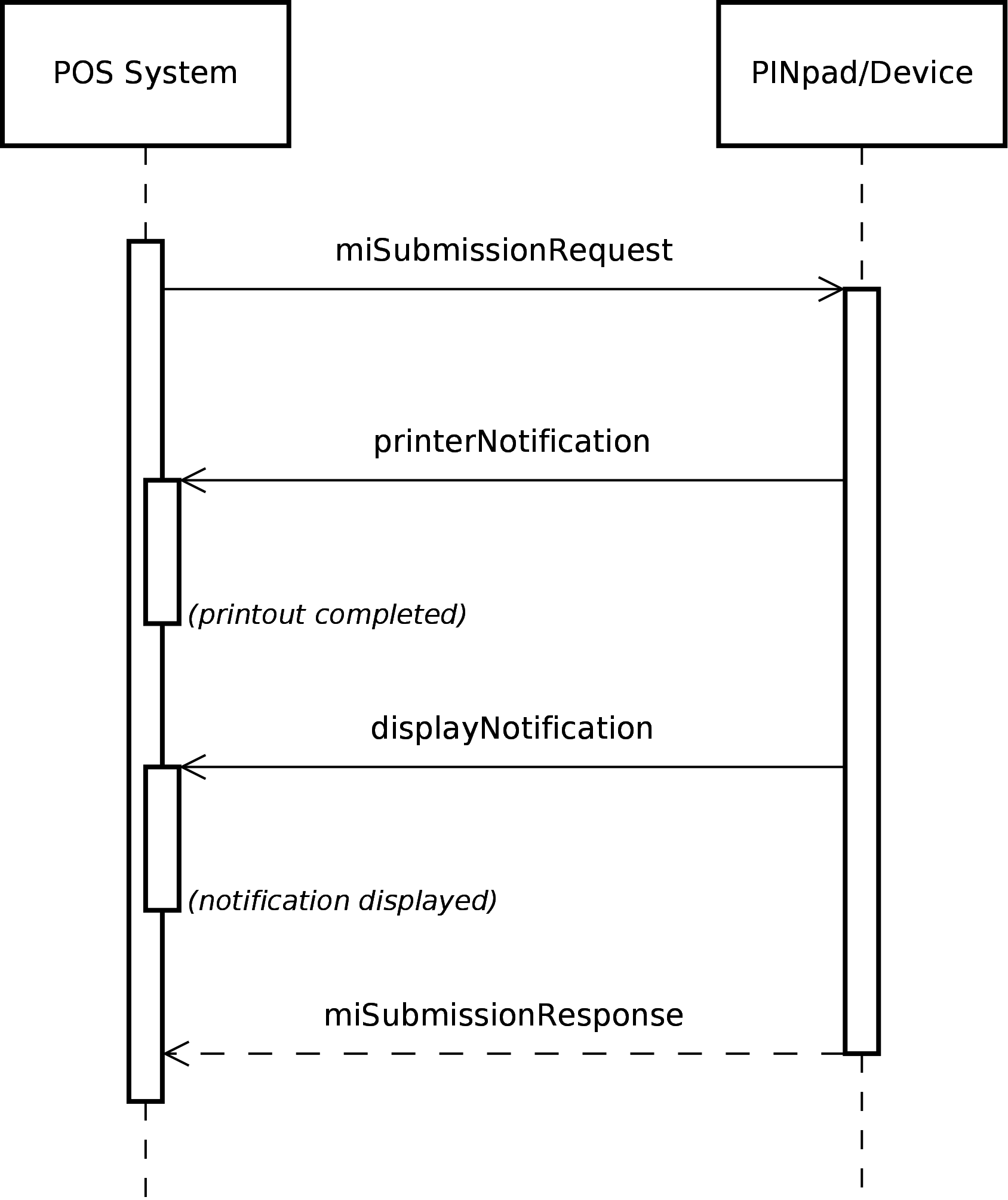 Submission communication example shows a communication in case of end-of-day, when a shift of information (esp. information related to off-line transactions) is needed. In this case dialogue is fulfilled by miSubmissionMessage. Please note that the device communicates twice with the PoS system using device messages within an operation of processing a single PoS message.