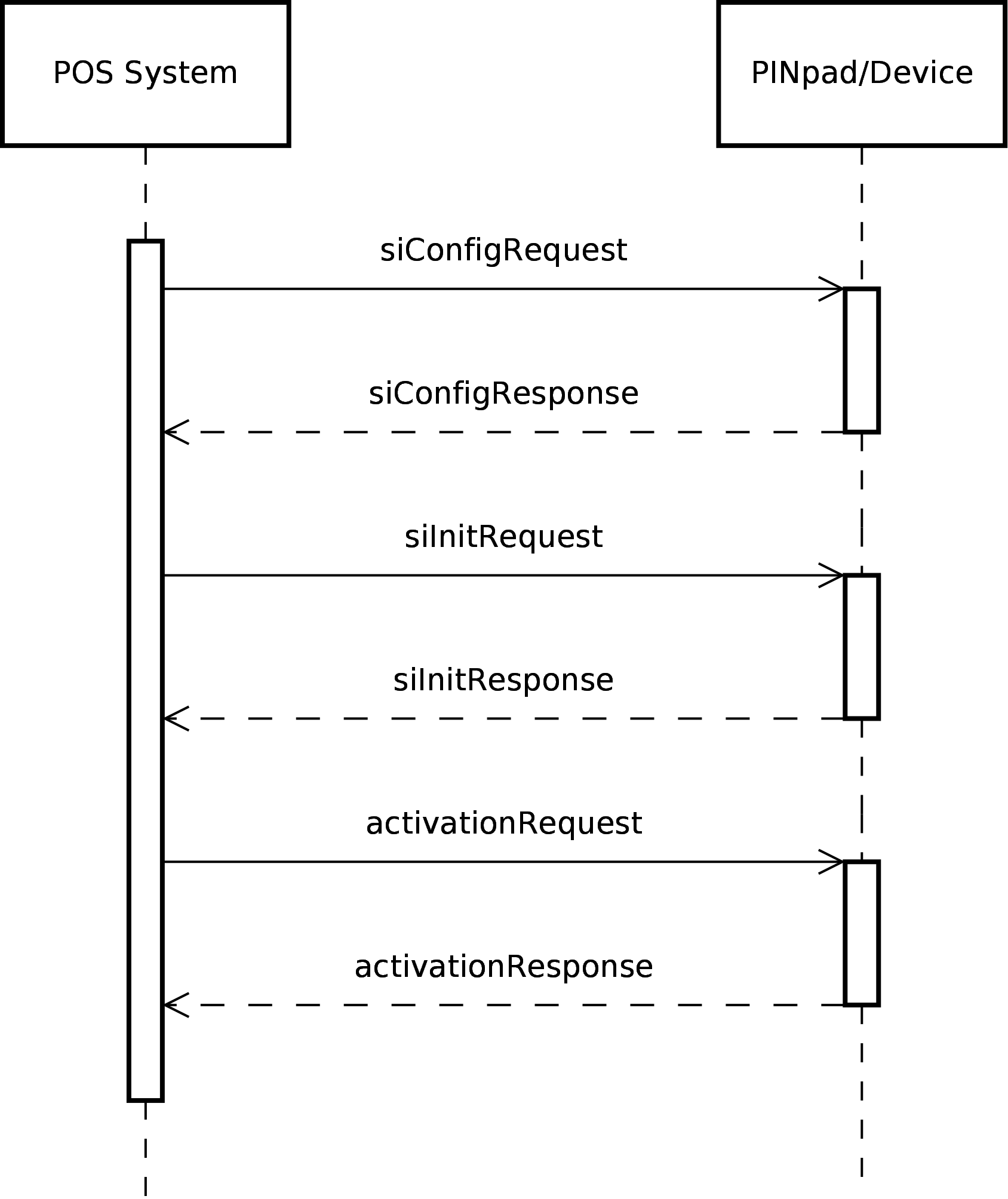 The simple example of communication between the POS system and the device includes three disjoint PoS messages: siConfigRequest, siInitRequest and activationRequest with three related responses.